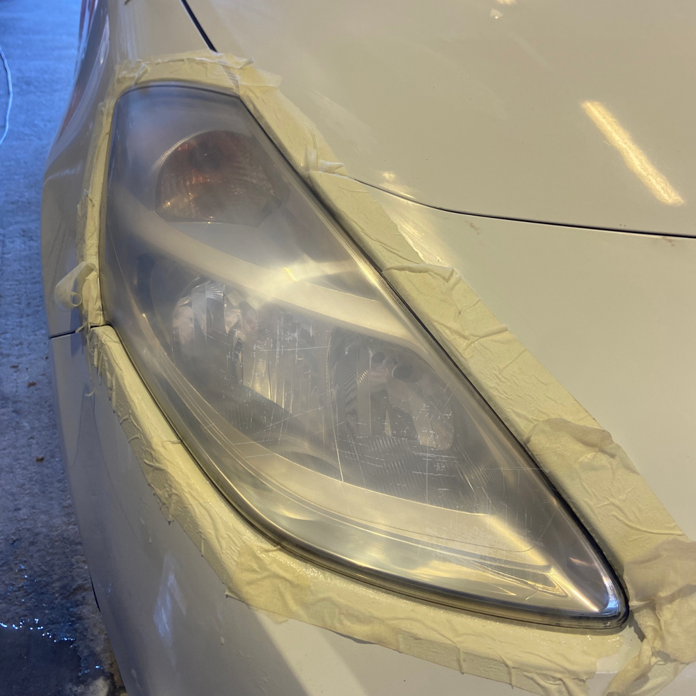 - Poncez délicatement les phares avec un disque abrasif de grain 800 en effectuant des mouvements circulaires. Ne forcez pas sur la pression et assurez-vous de poncer uniformément toute la surface du phare.